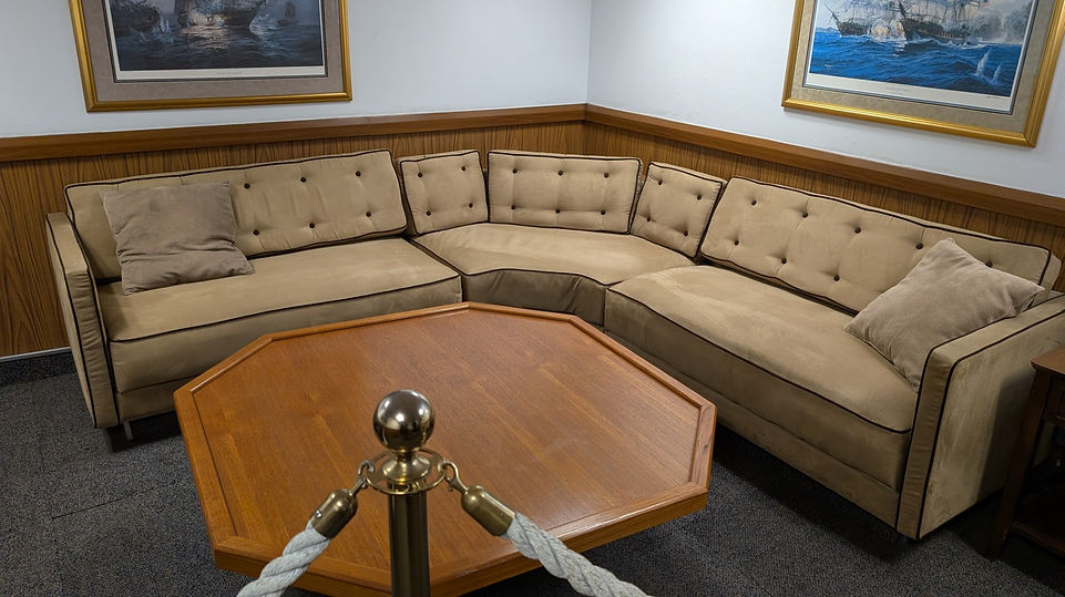 The Midway Museum preserves the Admiral's quarters, which include the Day Cabin shown here to illustrate the stark contrast between enlisted berthing and Flag officer accommodations. The artwork within the room—including aviation paintings and ship sketches—reinforces the identity of the ship's aviation mission and strategic naval role. During active service, access to this space was stringently controlled for security reasons, and it remained a center of authority and command, particularly during high-tempo operations or combat situations.