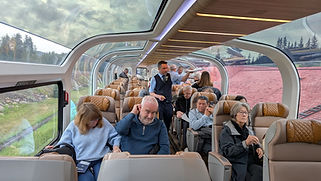 Rocky Mountaineer's GoldLeaf service, shown in this image, features two-level coaches. The main upper-level seating is under a panoramic glass ceiling that provides expansive views.