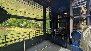 This photo is confusing; the grass and plants at the top appear to be reflections on the shiny ceiling. The vestibule is an outdoor viewing platform, letting passengers enjoy fresh air and scenery.